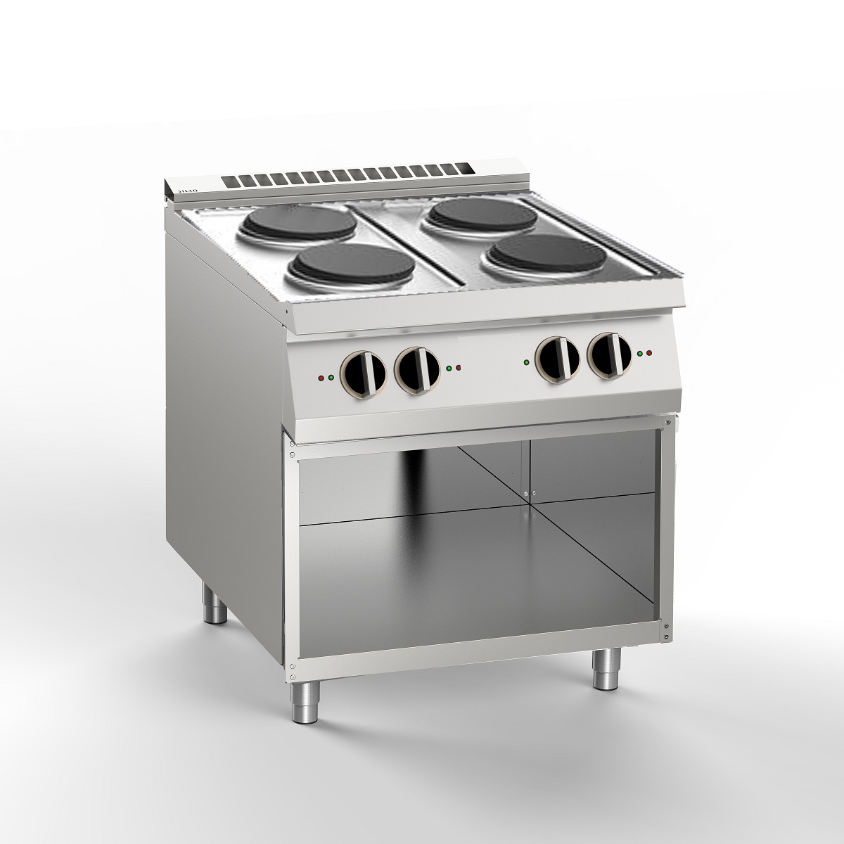 Mașină de gătit Linia 700 cu 4 plite(Ø22cm), pe suport deschis. Realizată din oțel inoxidabil AISI 304, top cu o grosime de 15/10. Plăci de încălzire din fontă, rotunde, cu o putere de 2,6 kW fiecare, fixate ermetic. Reglarea încălzirii de către un selector cu 7 poziții. Activarea încălzirii este semnalizată de o lampă de control portocalie plasată pe panoul de control. Plăcile sunt echipate cu termostat de siguranță cu resetare automată care intervine în cazul utilizării goale sau cu un vas inadecvat. Becuri pentru a verifica funcționarea corectă a echipamentului. Compartiment deschis de 800 mm. Picioare reglabile în înălțime din oțel inoxidabil