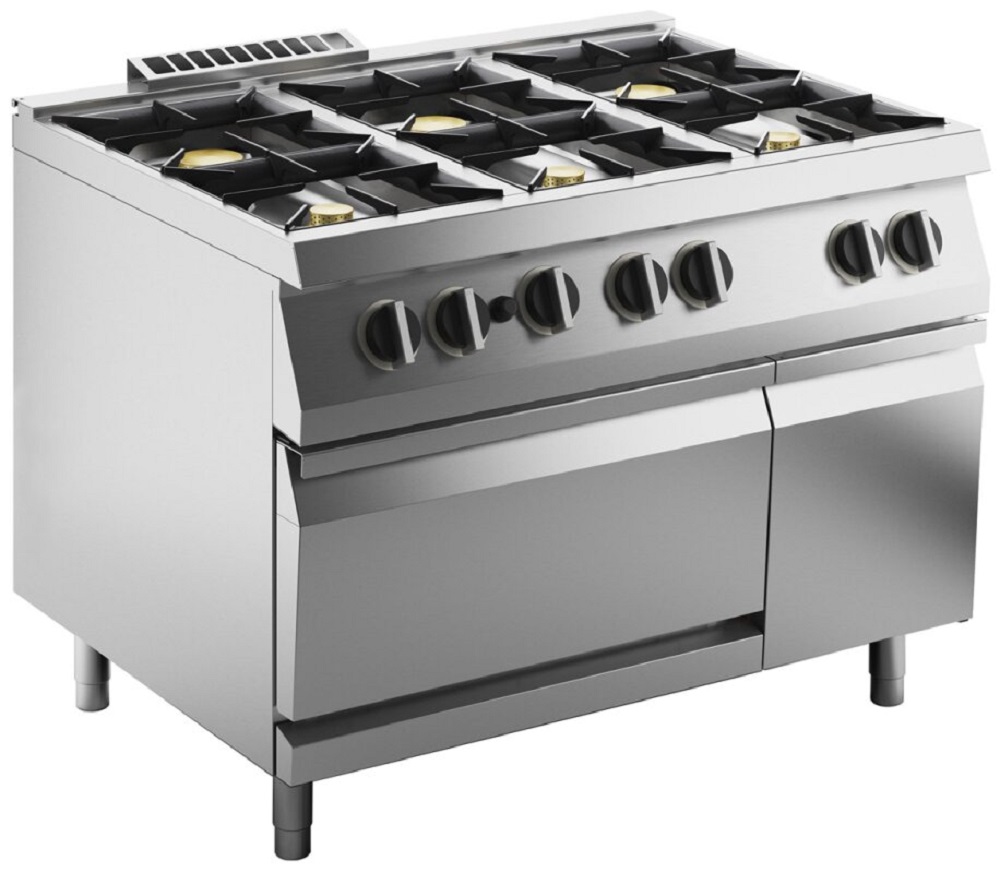 Mașină de gătit Linia 700 cu 6 arzătoare și cuptor pe gaz . Realizată din oțel inoxidabil AISI 304. Cele 6 arzătoare sunt perfect sigilate cu o putere maximă de 6 kW.Arzătorul pilot și termocuplul sunt amplasate sub corpul arzătorului principal, protejate împotriva impactului accidental și a eventualelor scurgeri. Grătar realizat din fontă emailată rezistent la acid, alcaline și flacără.Cuptor cu alimentare pe gaz GN 2/1. Dispune de picioare reglabile în înălțime, din oțel inoxidabil.