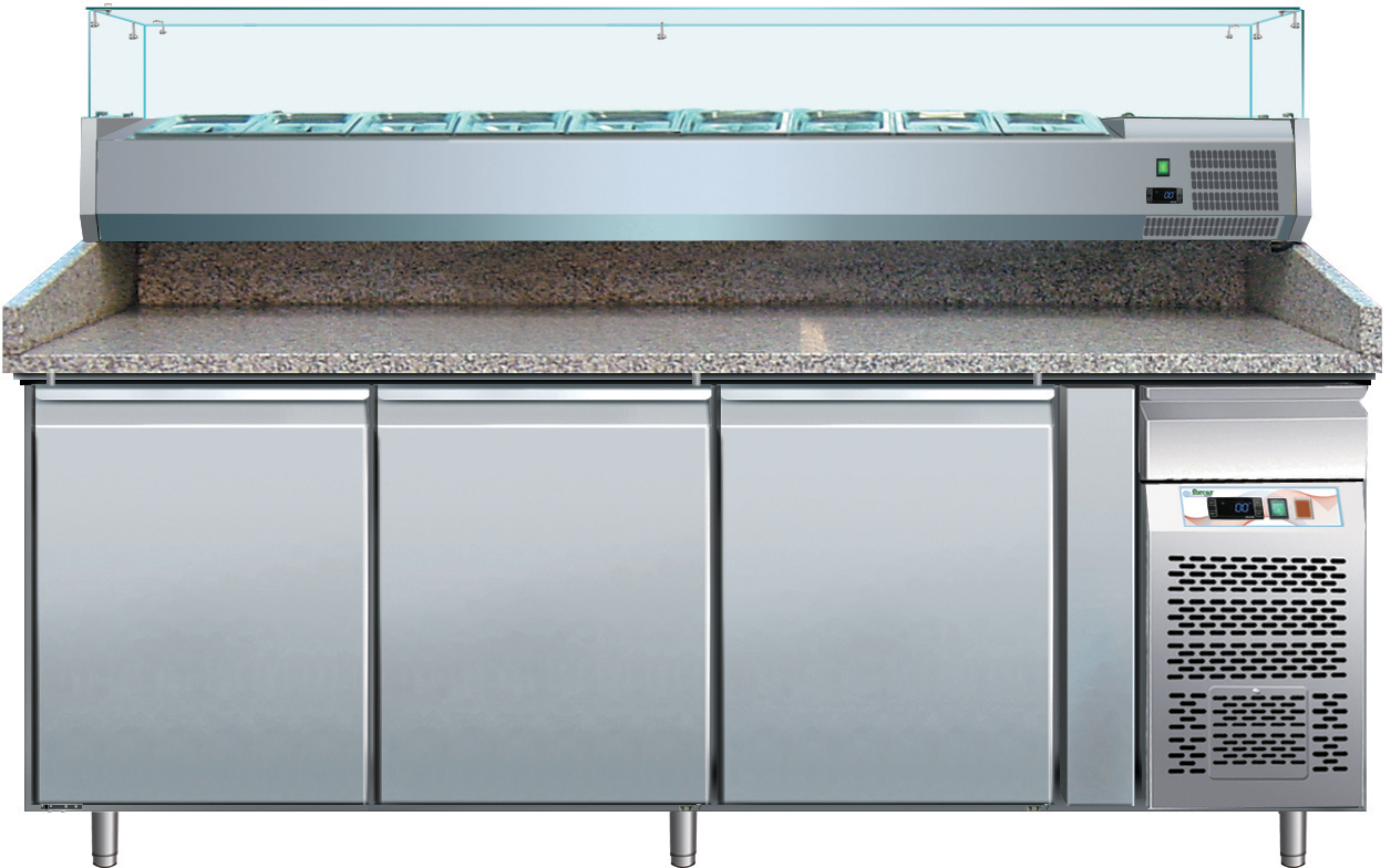 Realizată din oțel inoxidabil AISI 304, cu 3 uși și blat de lucru din granit, peste care se poate monta o vitrină frigorifică pentru ingrediente model RI20033V sau RI20038V,acestea nefiind incluse. Uși cu cheie și inchidere reversibilă pe arc. Răcirea ventilată,control electronic al temperaturii cu termostat digital. Rezistență electrică în jurul cadrului ușii pentru a elimina condensul. Decongelare automată cu rezistență electrică și control automat al temperaturii de dezghețare. Evaporarea automată a condensului. Evaporator tratat împotriva coroziunii. Interiorul are colțurile rotunjite pentru curațare ușoară.Picioarele din oțel inoxidabil AISI 304, reglabile în înălțime.