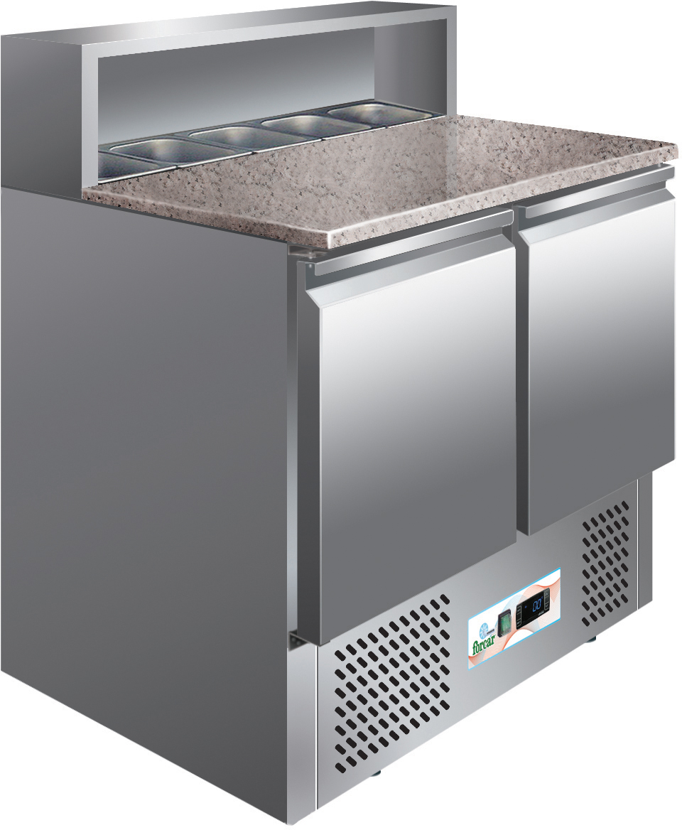 Realizată din oțel inoxidabil AISI 304, cu 2 uși și blat de lucru din granit. Răcire statică,control electronic al temperaturii cu termostat digital.Vaporizator static, spumat pe trei laturi pentru a face temperatura uniformă. Capac cu deschidere telescopică. Decongelare automată. Capacitatea bazinului 5 x GN 1/6, tăvile nu sunt incluse.